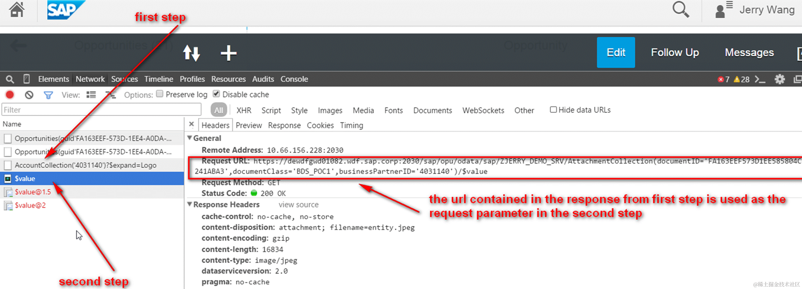Conclusion: The http request sent in second step is not issued by My Opportunity application, but by browser itself, once an image element is filled with actual url on its “src” property. To simply prove this conclusion: