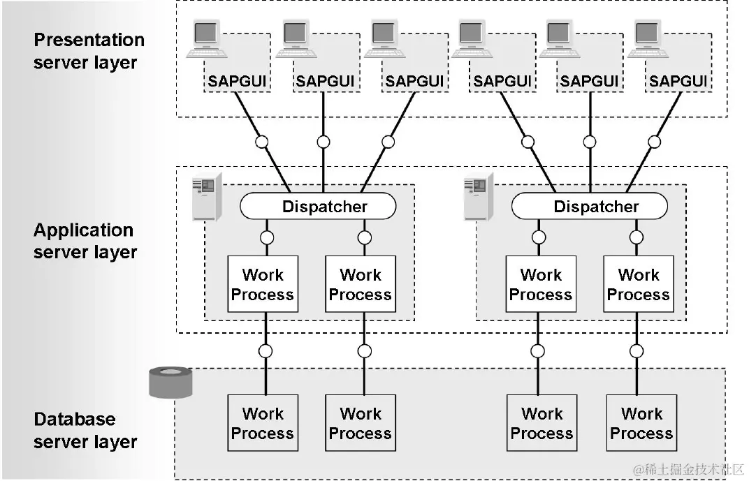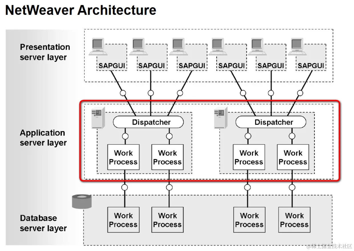 这里能看出应用服务器层是支持负载均衡的,SAPGUI的使用者会指定消息服务器Message Server的地址,