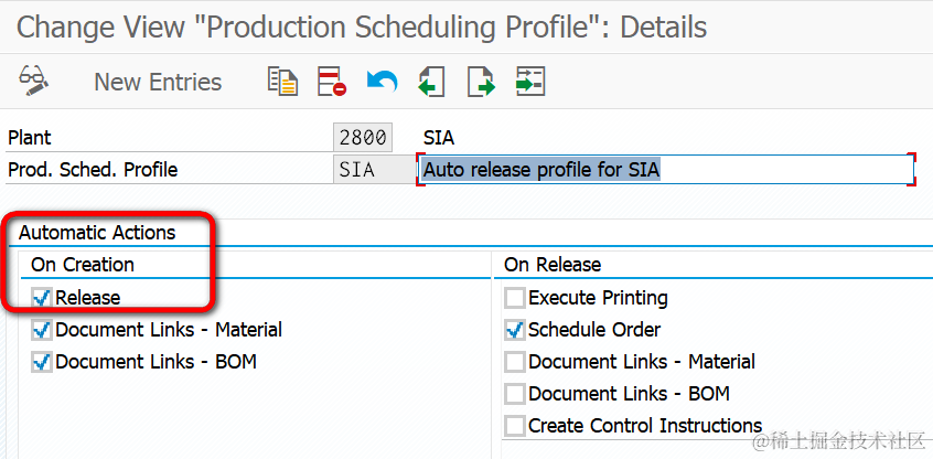 如下图所示:Automatic Actions标签页里的On Creation->Release勾选中,意思就是Production Order创建后自动释放。