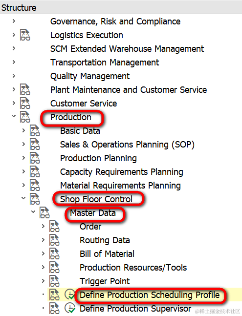 这个scheduling profile的配置在路径Production->Shop Floor Control->Master Data->Define Production Scheduling Profile里: