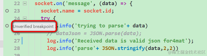 有的时候在Visual Studio Code里选中某一行设置断点,发现代码行号前面的圆圈是空心的,