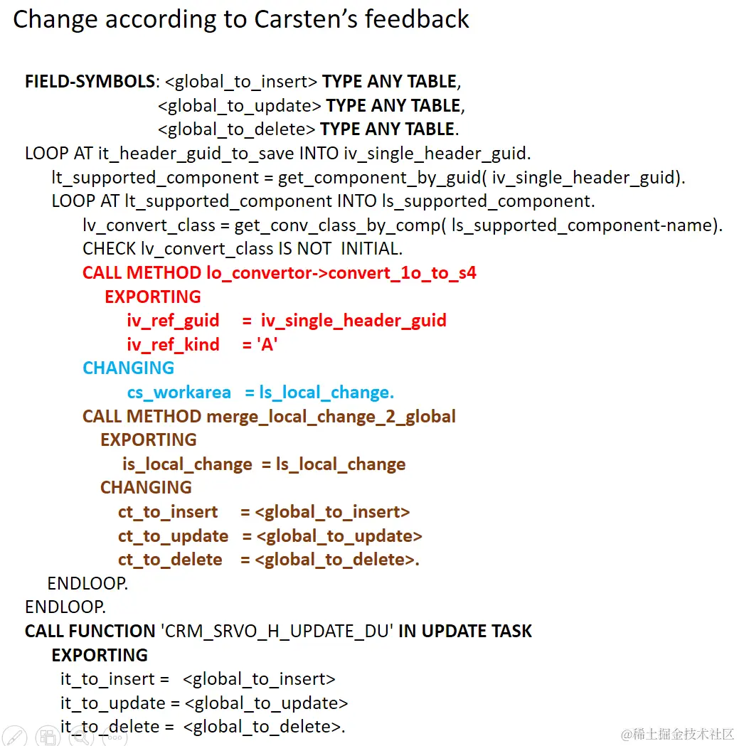 Carsten的这个proposal我最初脑子里也曾想过,但我觉得如果放到外面,这个method要能handle任意格式的Order node数据,而且需要能检测出Creation, Deletion和Update的任意一种模式,我觉得编程复杂度过高,没法给出effort estimation。如果放到convert class内部,那么内部convert class知道自己具体是什么structure,所以structure在convert里能够写死,这样做buffer merge简单得多。因此我做POC就按照简单的实现来做,没想到最后还是被Carsten callenge了。这个refact让我总结出一条结论,如果是做框架开发,具体实现复杂度不能成为影响design的决定性因素(作为参考可以).