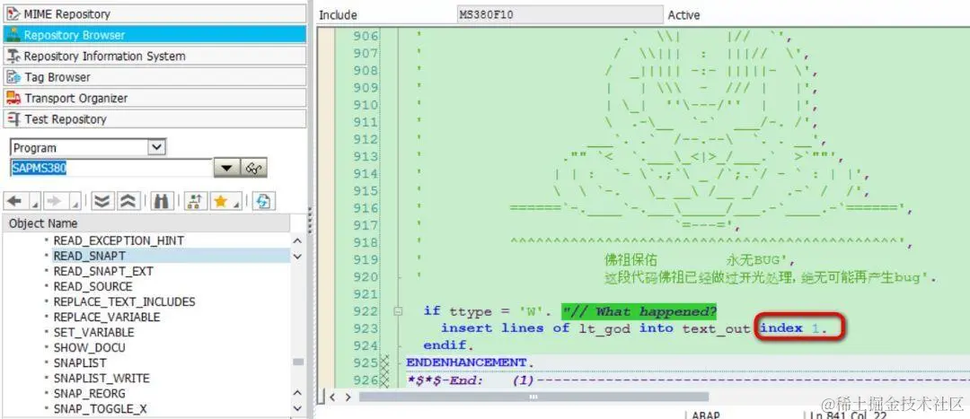 最终效果就是每次出现了运行时程序执行错误后,程序员到ST22里查看dump时,总能看到“佛祖保佑,永无BUG”几个字。