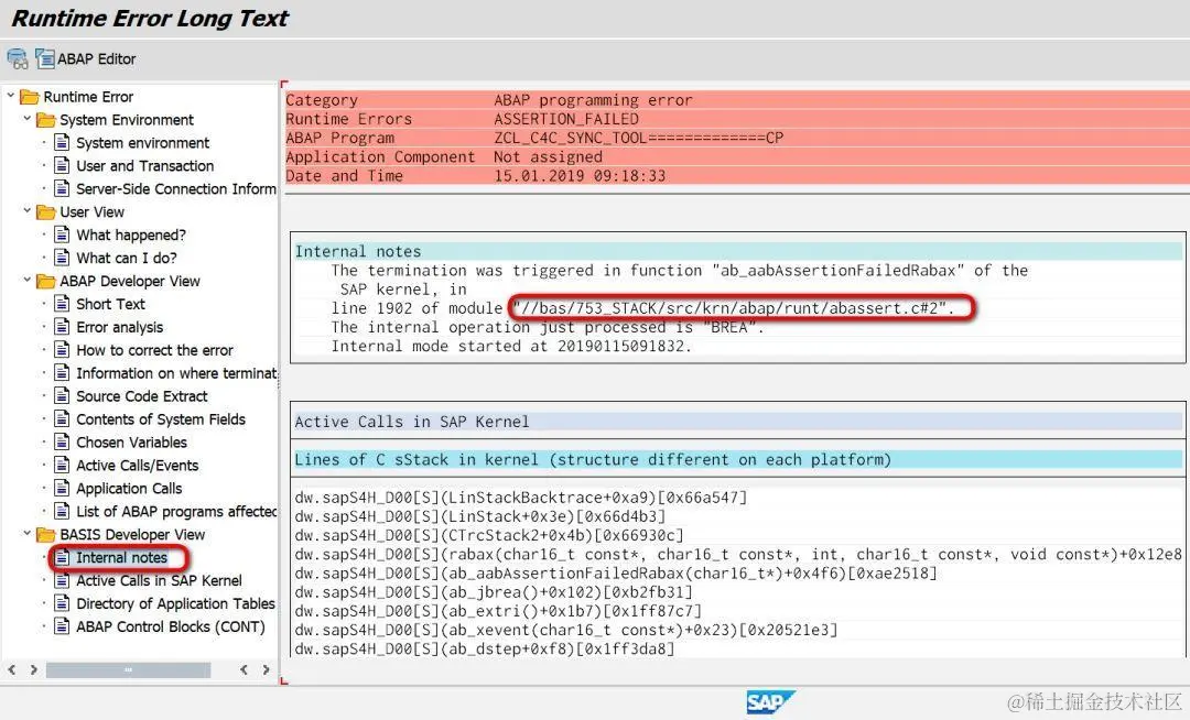 下图是ST22里dump的一个例子,值得一提的是大家可能会忽略的BASIS Developer View, 里面包含了引起运行时错误的ABAP语句对应的C语言实现的具体文件位置,比如下图的**//bas/753_STACK/src/krn/abap/runt/abassert.c**。
