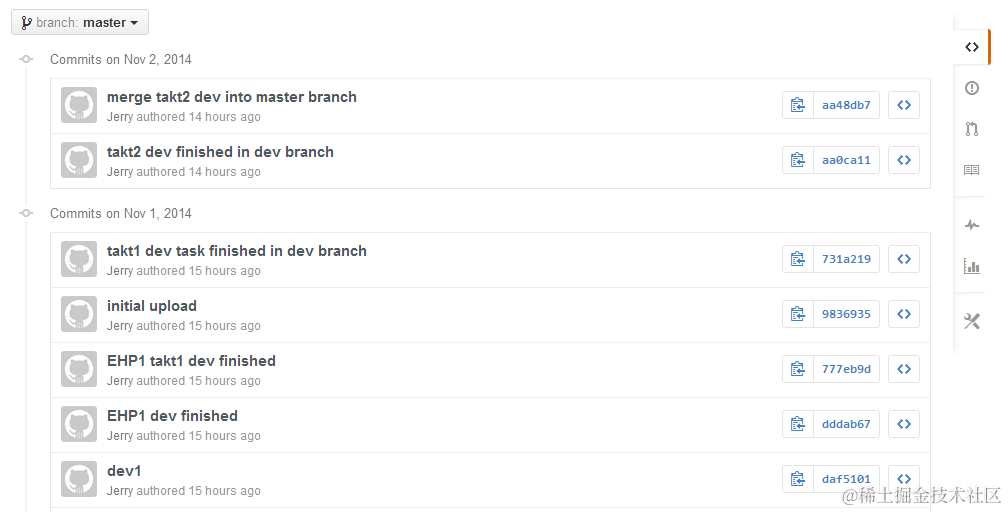 By clicking the “32 commits” we could have a detail review about each commit in github: