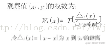 任意一点(xi, yi)的权数是xi处权数函数曲线的高度。任意一点对于拟合直线的影响大小,依赖于对应的权数。接近x6的点在决定拟合线中扮演主要角色,条形外的点,不起到作用。