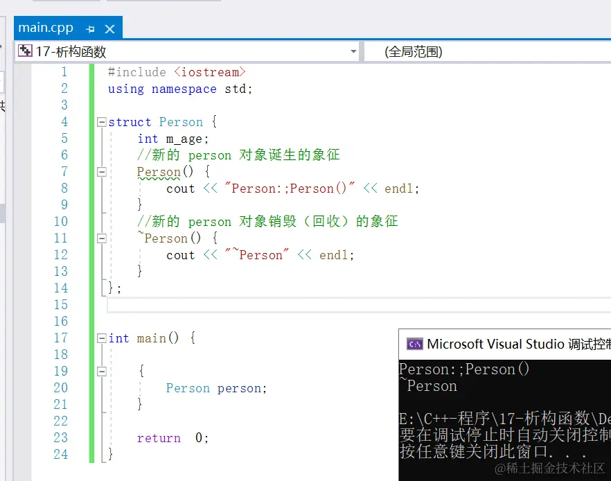 只要程序还在运行,就无法看到析构函数,除非杀死进程停止程序