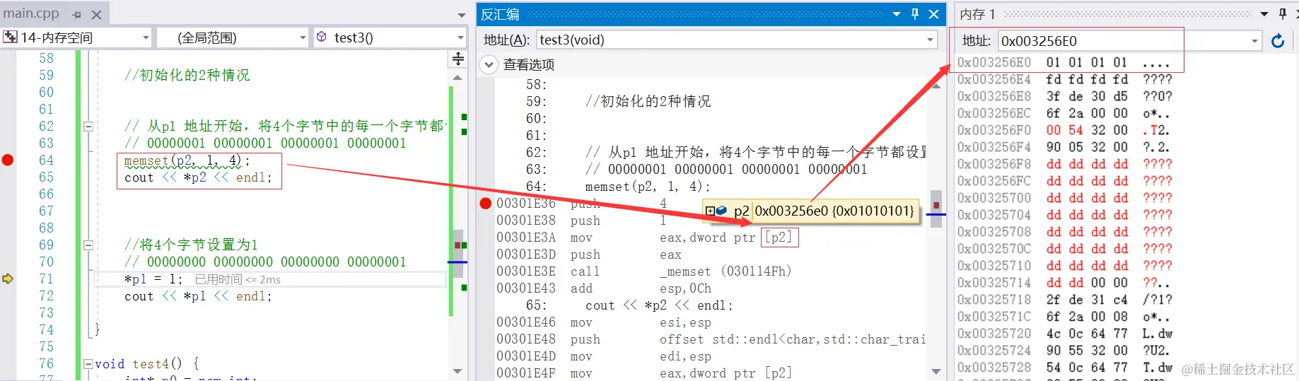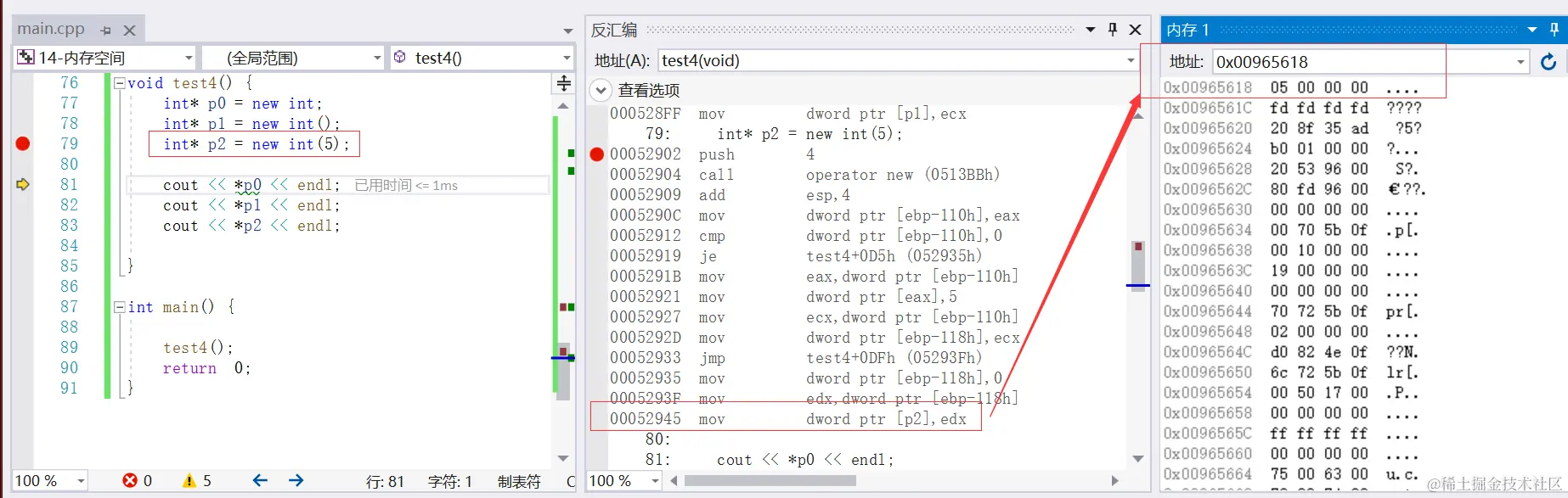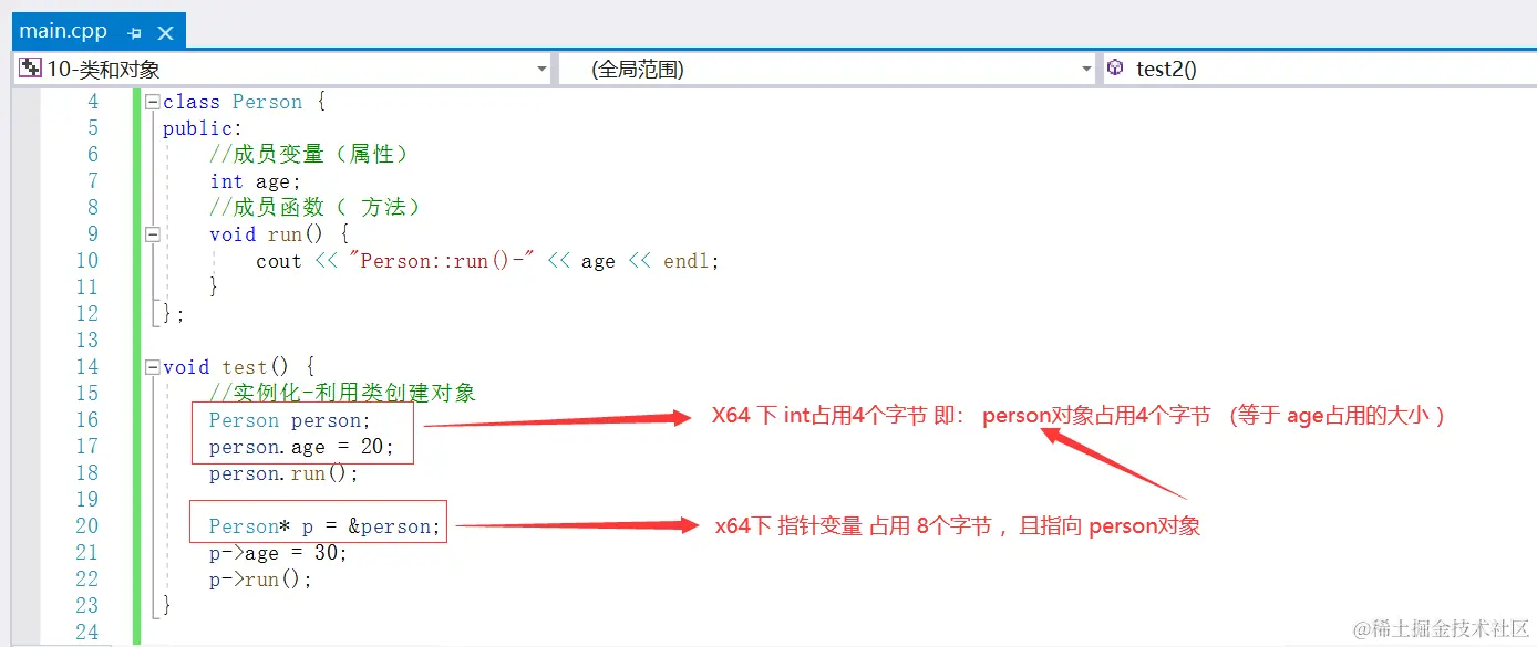 person对象和p指针一共占用12个字节(4字节person+8字节*p)