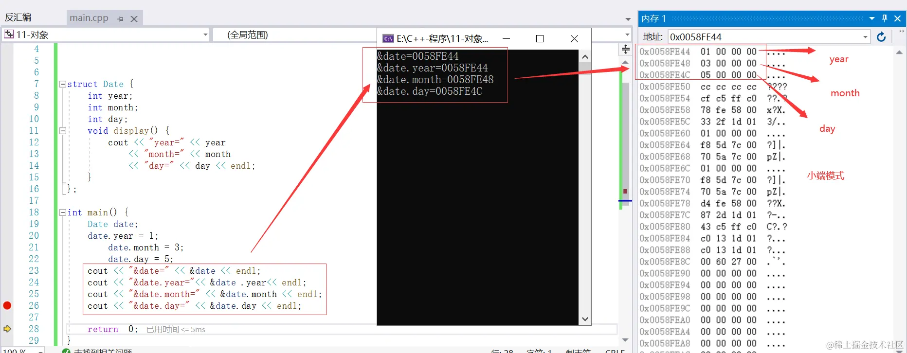 结论:可见class 和 struct反汇编是一致的,也就是说除了 1.1.1的性质区别,class 和 struct本质上是没区别的