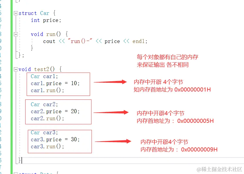1)每一个 car 对象都在栈空间开辟了4个字节的存储空间