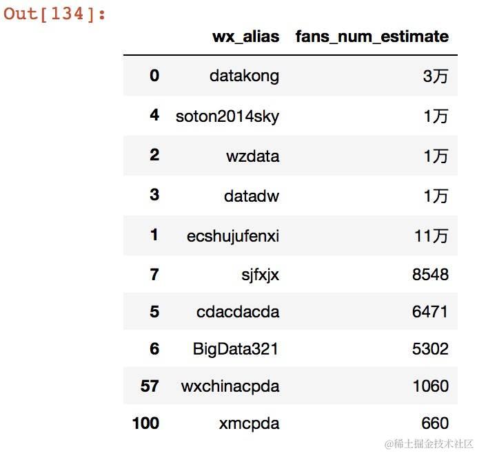 mydata.sort_values('fans_num_estimate', ascending=False).head(10).loc[:,['wx_alias','fans_num_estimate']]