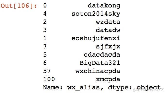 mydata.sort_values('fans_num_estimate', ascending=False).head(10)['wx_alias']