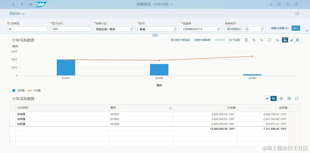 您可以显示一个混合视图,查看图表中的差异,同时显示表中的详细信息。也可基于您为销售计划版本定义的维度来进一步比较计划数据和实际数据。