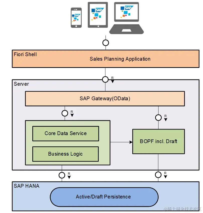 应用使用了ABAP DRAFT 框架(能支持数据更改的自动草稿存储,类似于Excel或Word的自动保存,但是这里实现的是草稿保存, 即随时可以取消,并且在用户显式点击保存后,会转移到永久存储区域),同时,该应用使用事务操作的CDS(Core Data Service)建模继而通过BOPF框架实现业务对象管理,并通过OData将后台数据服务发布,最终通过前端的Fiori应用进行呈现。