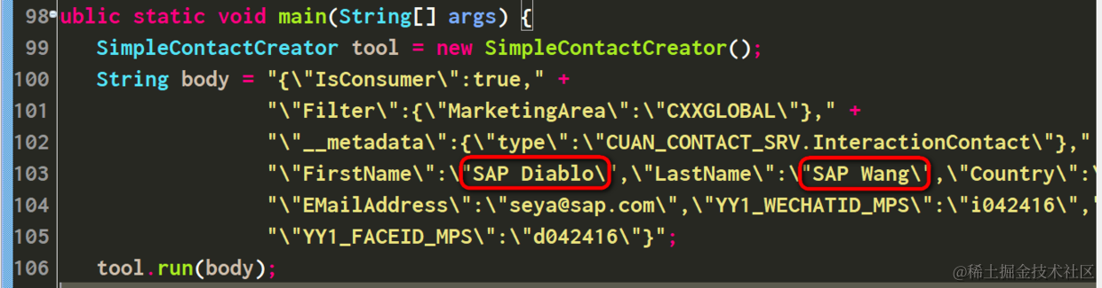 上述代码里,我硬编码了一个Contact的姓为SAP Wang,名为SAP diablo,