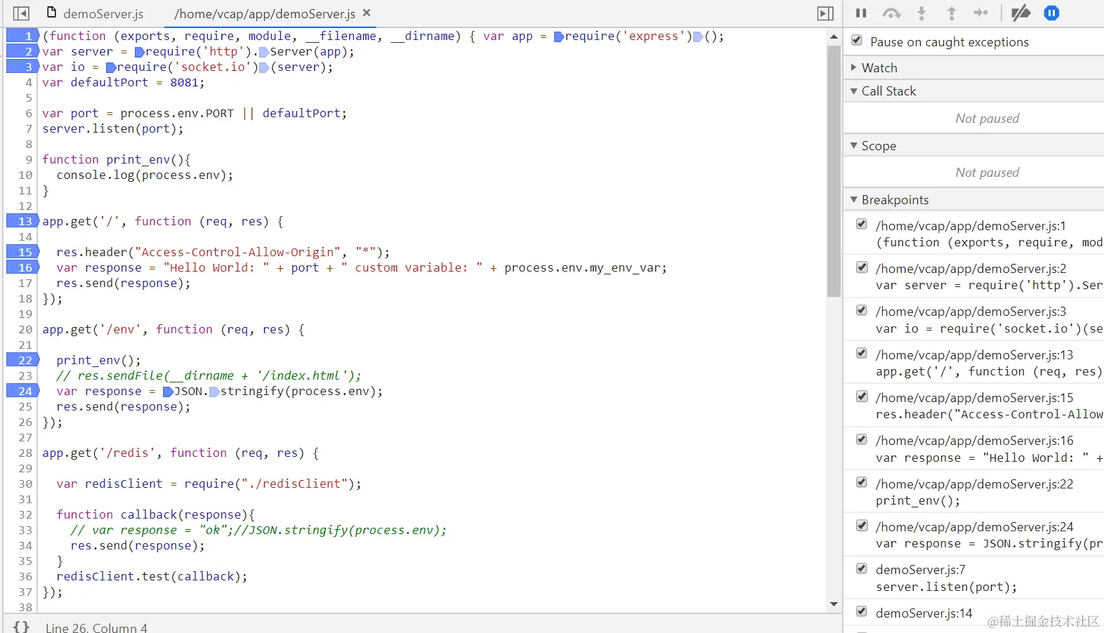 然后在浏览器里再次输入应用的url,断点触发,就可以开始远程调试了: