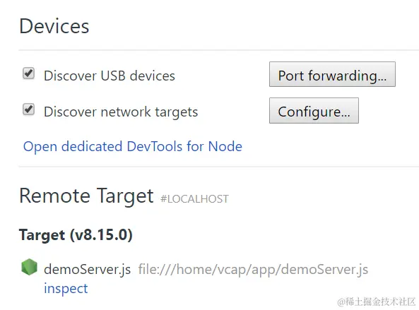 接下来,我们在Chrome地址栏输入chrome://inspect, 即可看到运行在CloudFoundry上的应用已经可以本地调试了: