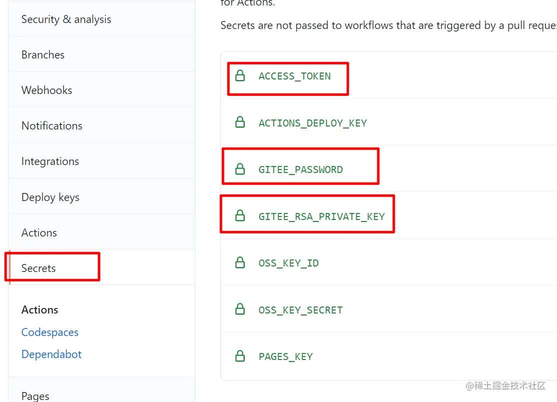 同之前步骤相同,之后用于环境变量的配置,就是以下3条secret,OSS的是自动部署到阿里OSS的脚本使用的,我是放在一个脚本里运行,需要了解可以看我另一篇文章。