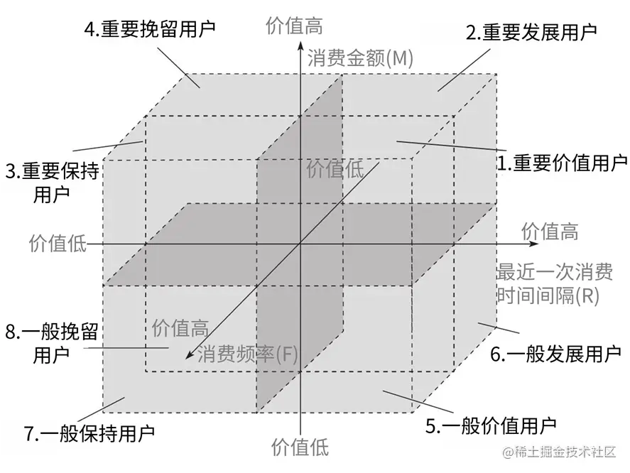 每个指标越大=>用户价值越高,用3个指标作为XYZ坐标轴,将空间分成8个部分进行分析
