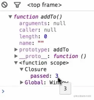 可以清楚的看到,addTo 函数作用域链上存在一个闭包环境,该上下文中存储的就是在全局中定义的变量 passed 。