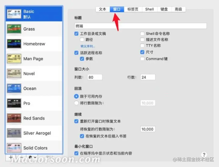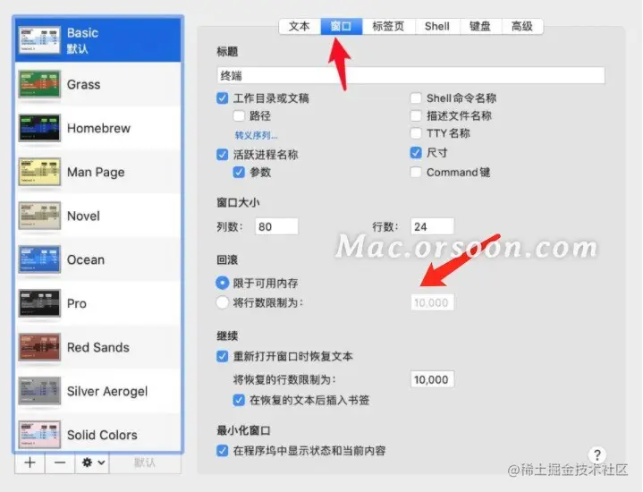 Mac上“终端”中限制回滚行数的具体操作方法? Windows阿咪 2021-04-24 842 阅读1分钟 使用“终端”偏好设置,您可以更改保留在会话中的行数。那我们如何在Mac 上的“终端”中限制回滚行数呢?跟小编一起来看看具体方法吧! 具体步骤如下: 1.在 Mac 上的“终端” App中,选取“终端”>“偏好设置”。 2.然后点按“描述文件”。 3.在左侧的描述文件列表中,选择描述文件,点按“窗口”。 4.在“回滚”部分,选择“将行数限制为”,然后输入行数。 以上就是在Mac上的“终端”中限制回滚行数的具体操作方法,希望对大家有所帮助,想了解更多关于Mac相关教程,请关注‘未来软件园’吧!