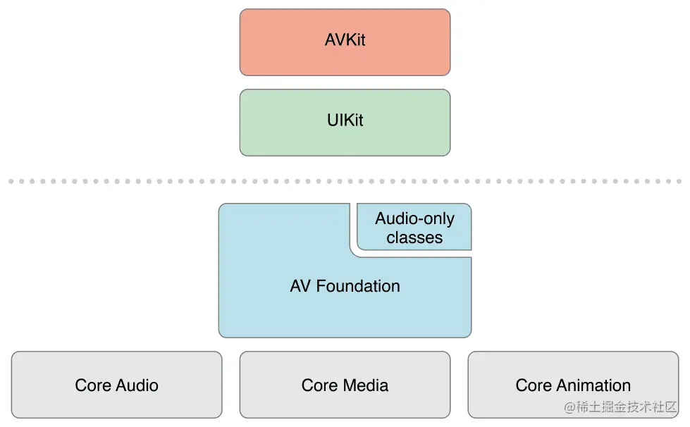 AVFoundation是iOS开发者可以用来播放和创建基于时间的视听媒体的几个框架之一,其提供了检查、创建、编辑或重新编码媒体文件的接口,也使得从设备获取的视频实时数据可操纵。下图是AVFoundation在iOS上的体系结构