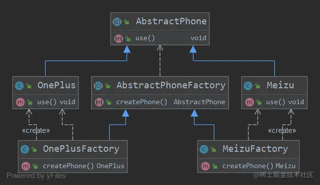 这个例子中有两个具体工厂类,生产魅族手机的工厂和一加手机的工厂