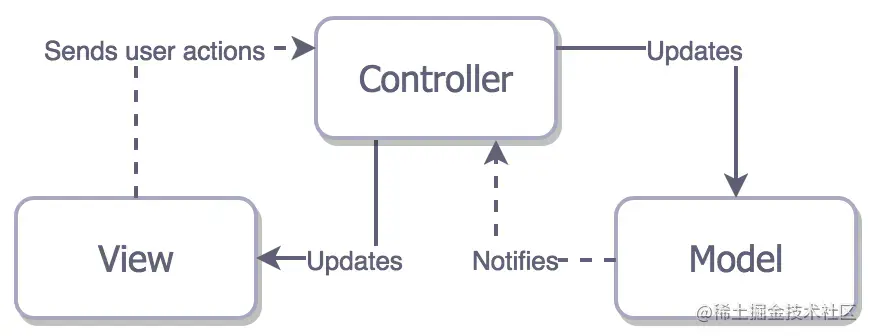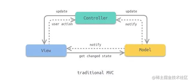 传统MVC模式如图所示(实线表示调用,虚线表示通知)