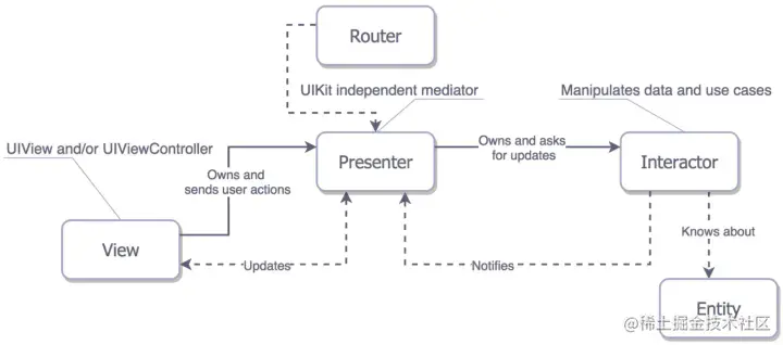 VIPER的全称是View-Interactor-Presenter-Entity-Router。示意图如下:
