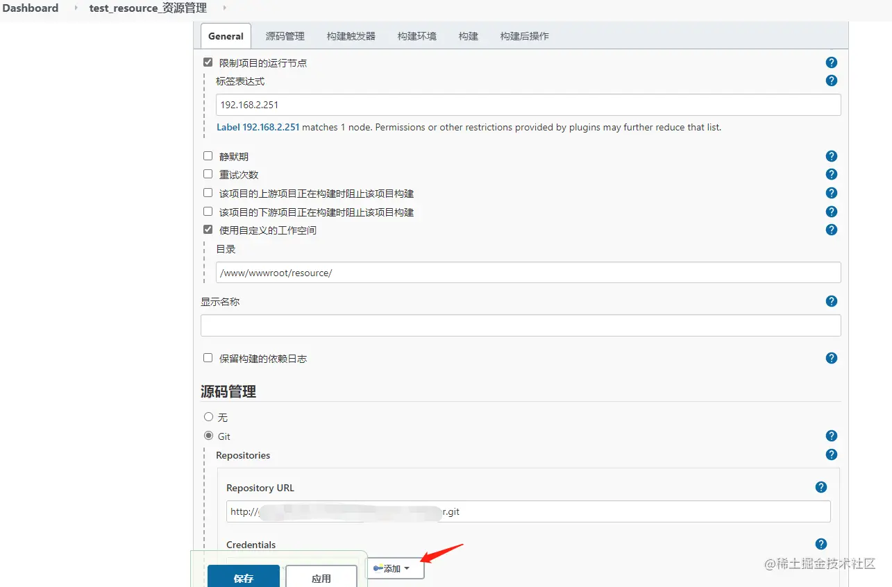 2.配置参数,其中需要添加git仓库的账户,ssh可以使用公钥,http的可以使用账户密码,这里使用的gitlab http,所以使用账号密码