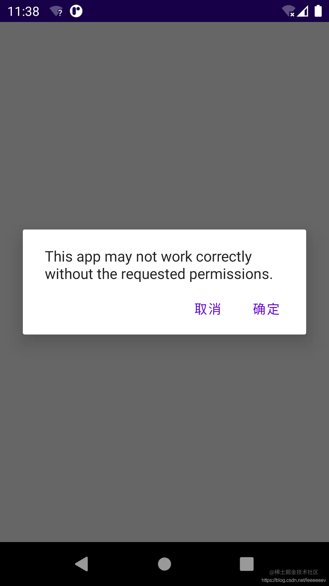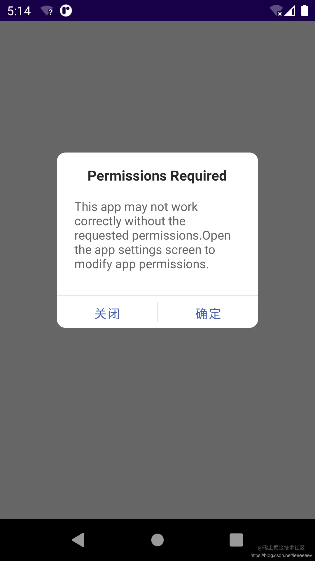 - 提示框2: 用户拒绝权限且选择以后都不再询问时提示,在收到拒绝回调时show出内置的AppSettingsDialog。