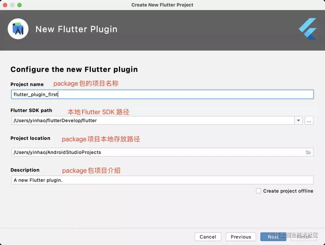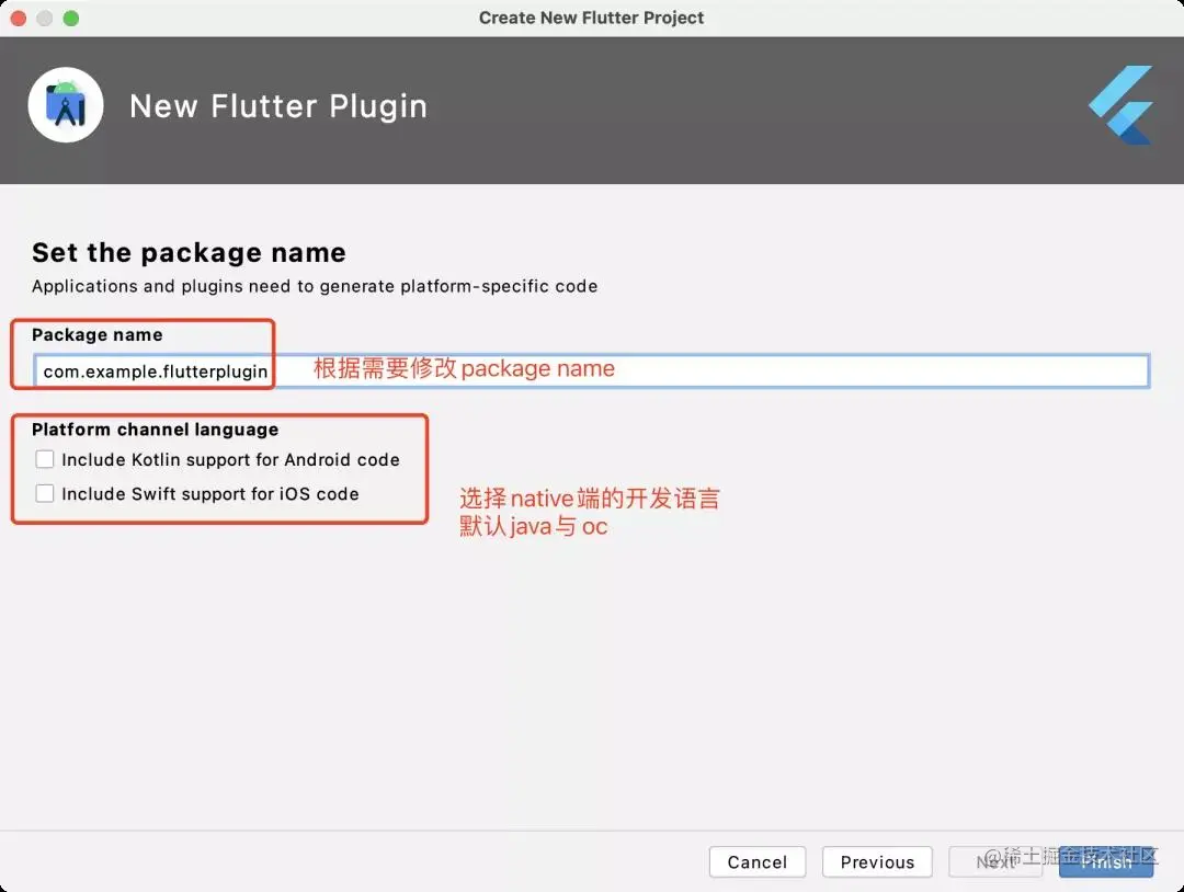 flutter create --org com.example --template=plugin --platforms=android,ios -a kotlin -i swift pluginPackageName 参数: