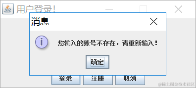 JOptionPane.showMessageDialog(this, "您输入的账号不存在,请重新输入!");