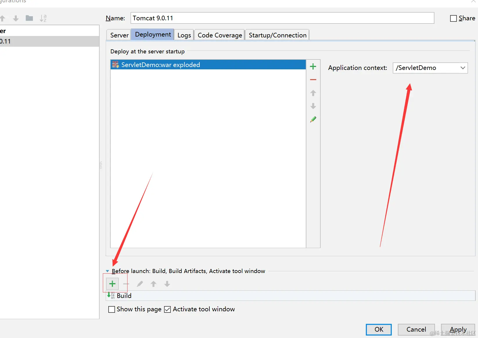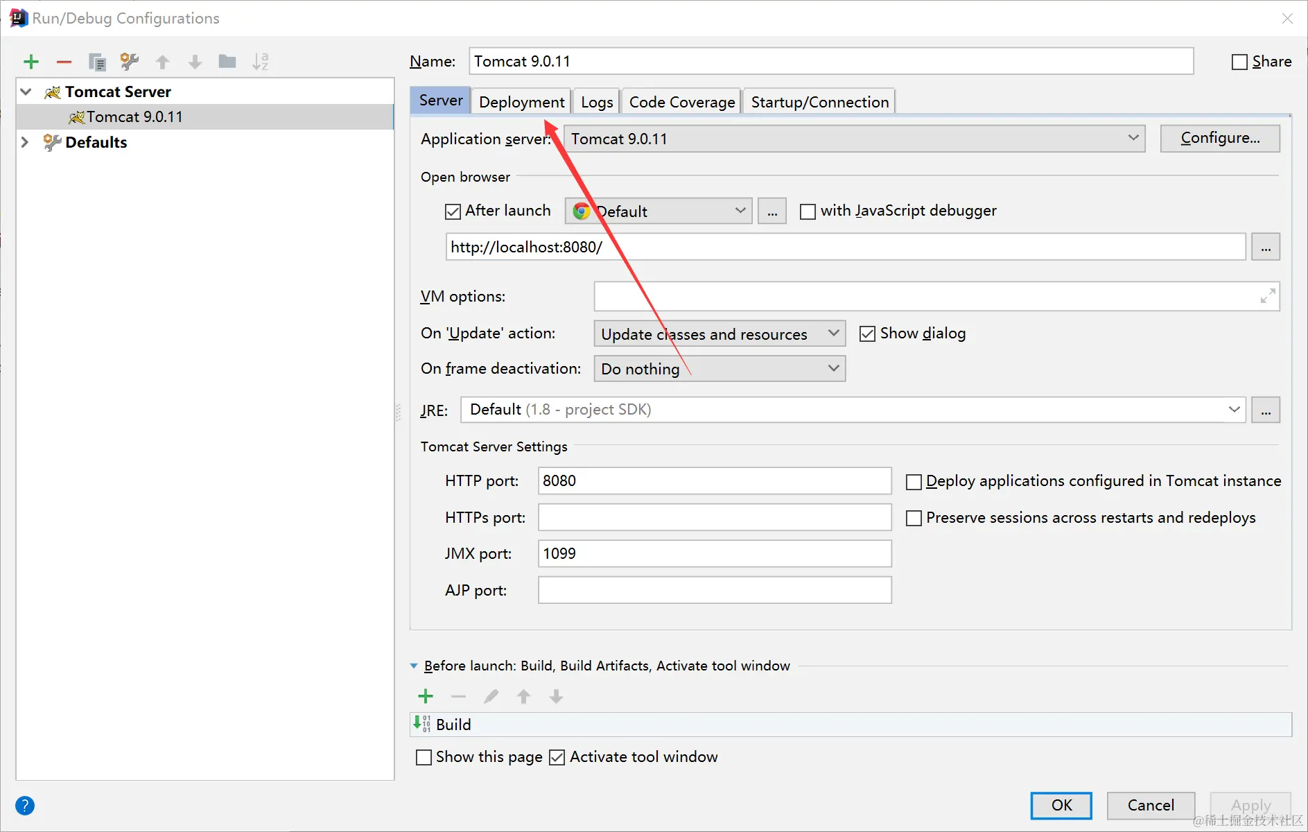 点击后进入配置界面 检查一下Tomcat的配置内容,然后点击箭头所指的Deployment