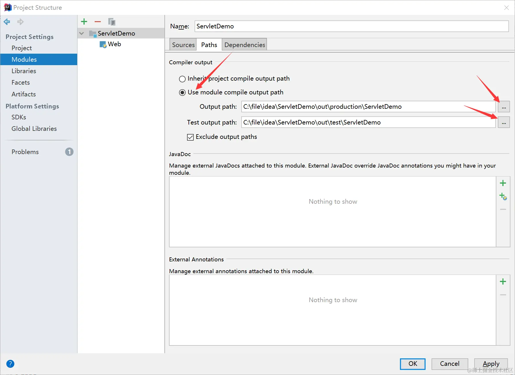 点击左侧modules,再在右侧点击path选项 点击Use module complies out path