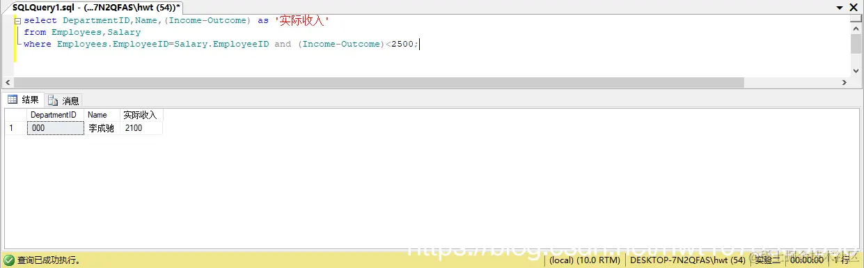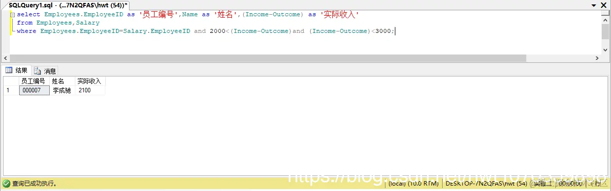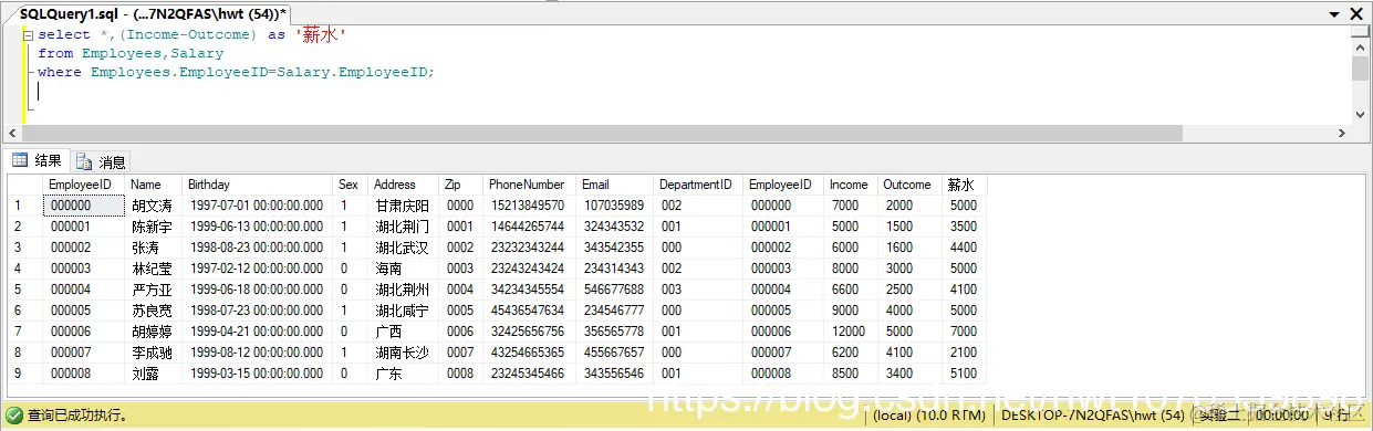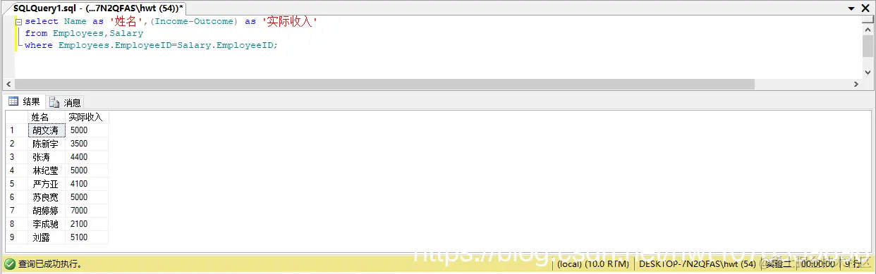 select Employees.EmployeeID as '员工编号',Name as '姓名',(Income-Outcome) as '实际收入'