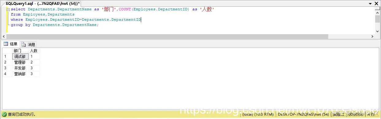 select Departments.DepartmentName as '部门',COUNT(Employees.DepartmentID) as '人数'
