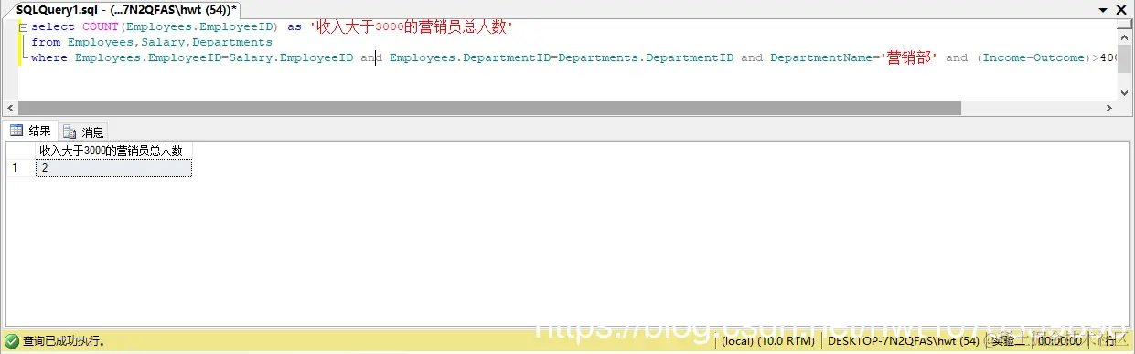 where Employees.EmployeeID=Salary.EmployeeID and Employees.DepartmentID=Departments.DepartmentID and DepartmentName='营销部' and (Income-Outcome)>4000;