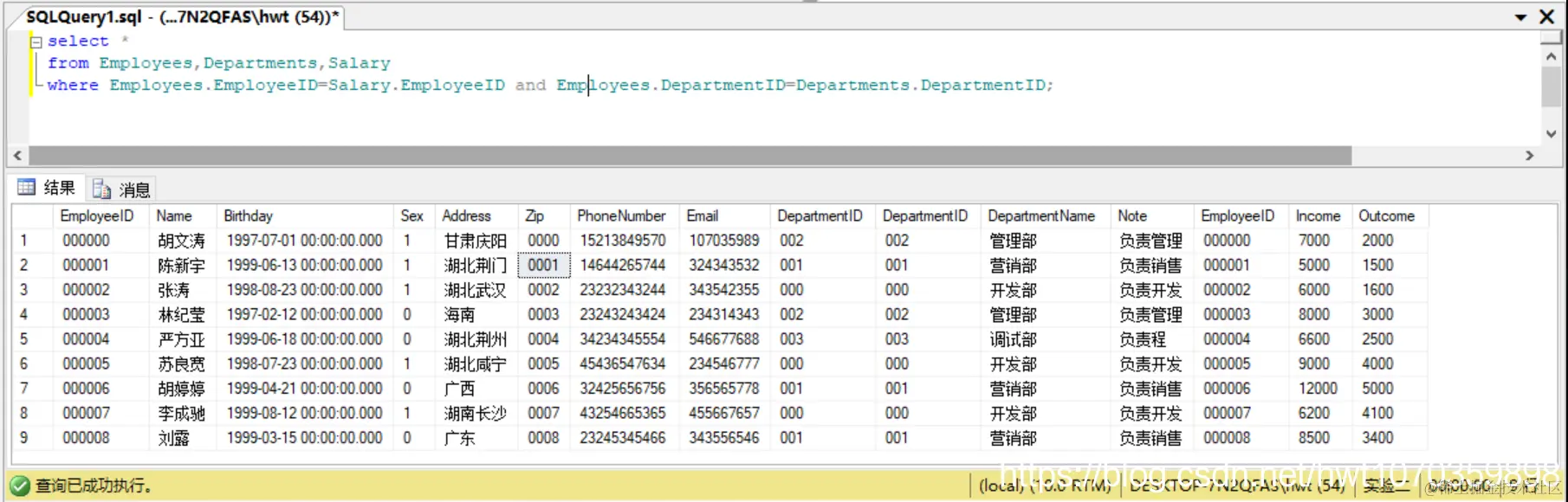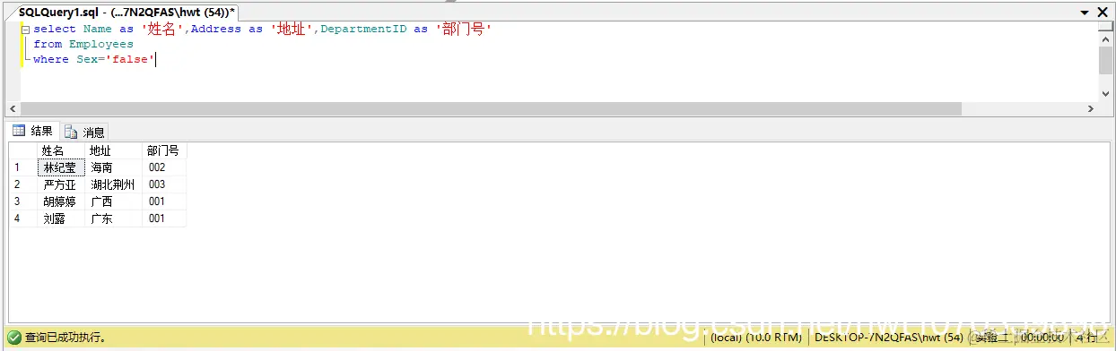 select Name as '姓名',Address as '地址',DepartmentID as '部门号'