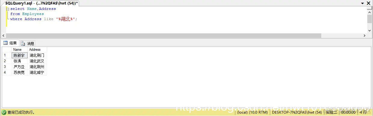 13、找出所在其地址中含有“湖北”的员工的姓名及地址。