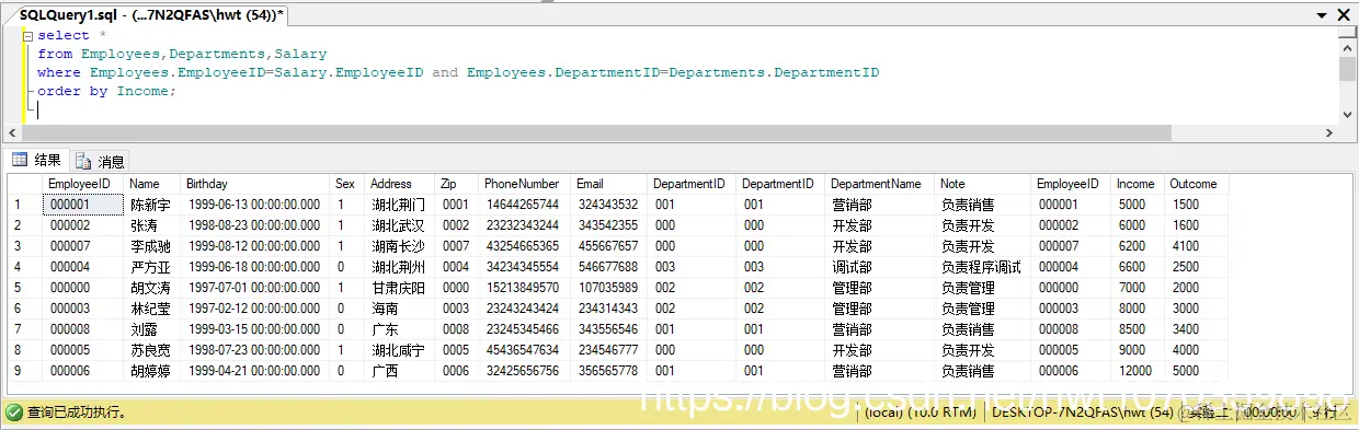 5、将各员工的情况按收入由低到高排序。