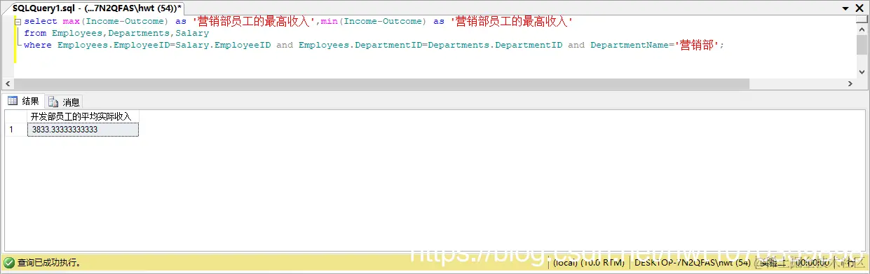 select max(Income-Outcome) as '营销部员工的最高收入',min(Income-Outcome) as '营销部员工的最高收入'