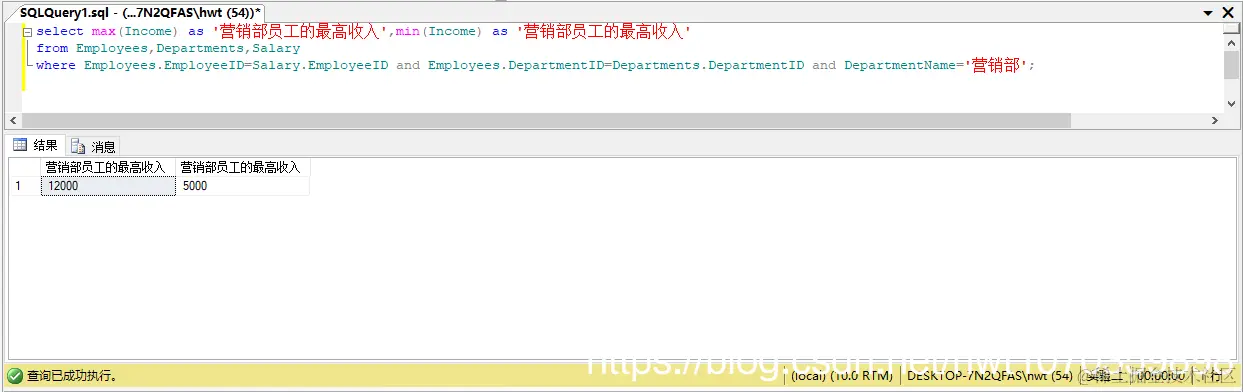 select max(Income) as '营销部员工的最高收入',min(Income) as '营销部员工的最高收入'