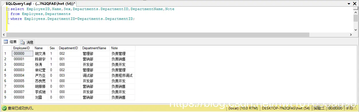 select EmployeeID,Name,Sex,Departments.DepartmentID,DepartmentName,Note