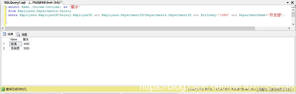 where Employees.EmployeeID=Salary.EmployeeID and Employees.DepartmentID=Departments.DepartmentID and DepartmentName='开发部';