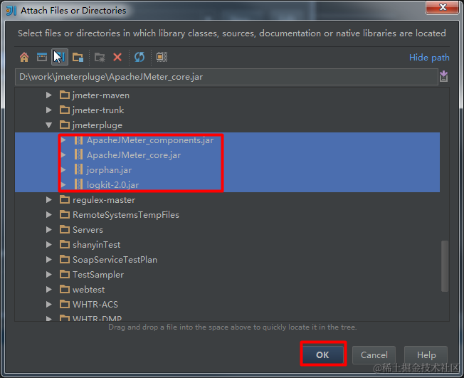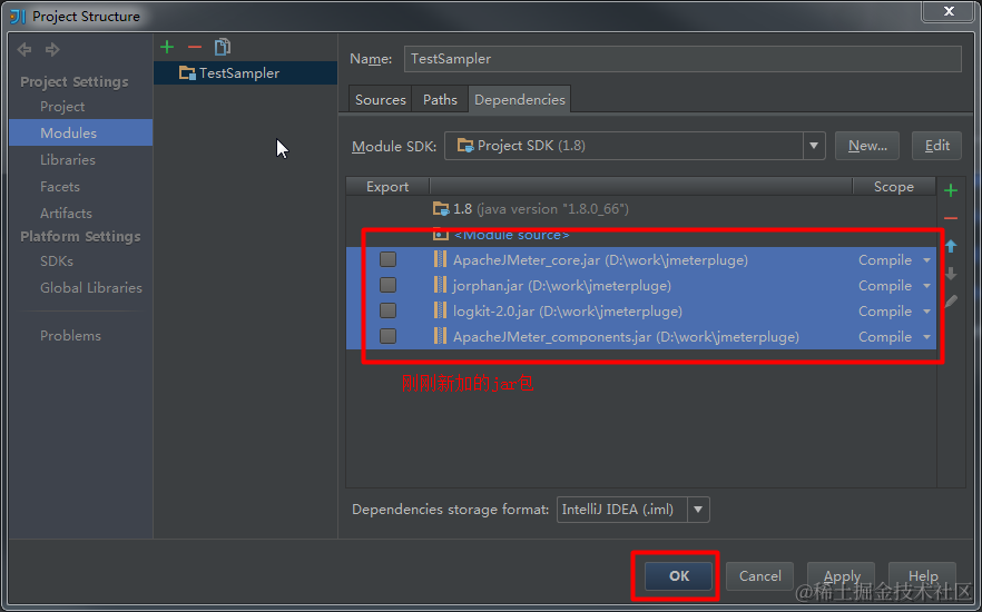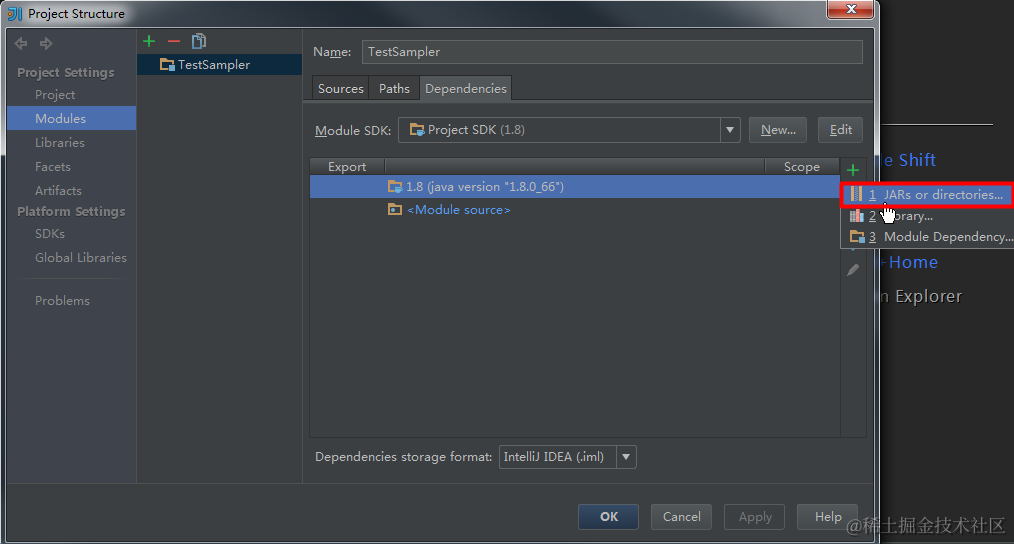 3、在 “Dependencies” 标签界面下,点击右边绿色的 “+”号,选择第一个选项“JARs or directories...”,选择相应的jar包,点“OK”,jar包添加成功