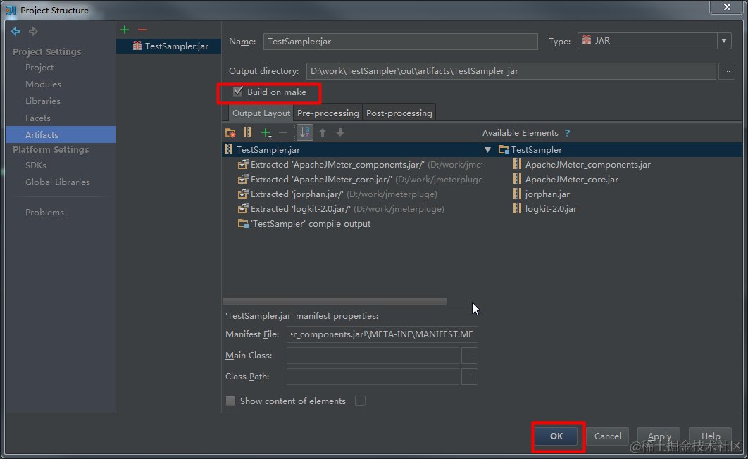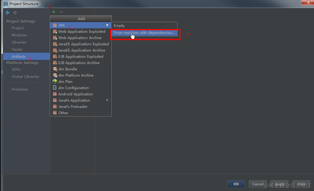 2、Artifacts->"+",选jar,选择from modules with dependencies,后有配置窗口出现,配置完成后,勾选Build on make >ok保存