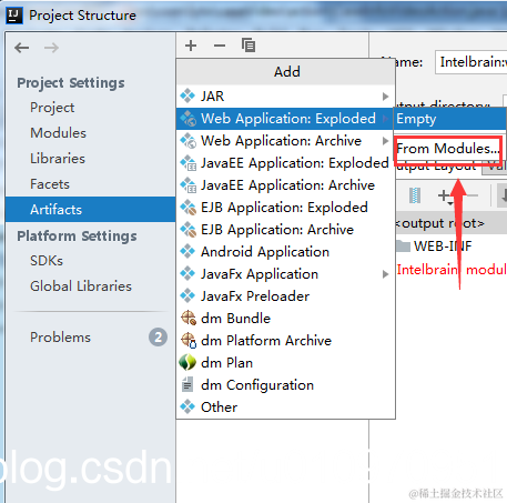 4.4配置Artifacets,点击+号。选择Web Application Exploded->From Module,选择之前配置的Module。