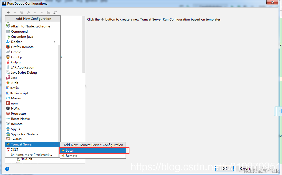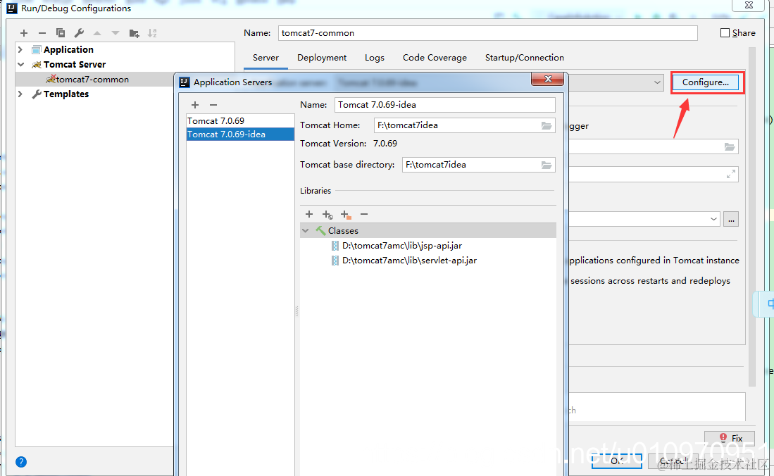点击Configure,弹出Application Servers,点击+号。新增一个tomcat,并且选中tomcat目录