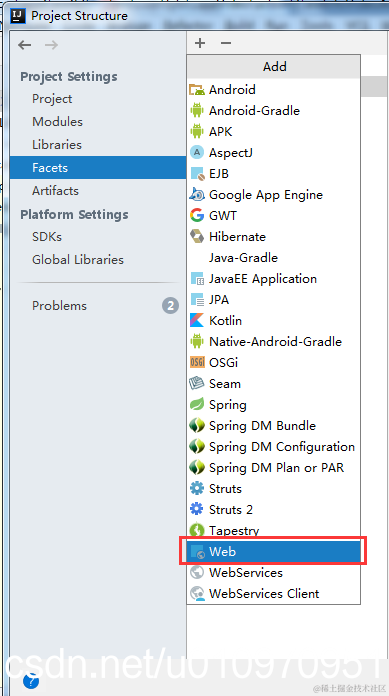 4.3配置facets,点击上方+号。选择web,选择刚才配置的Modules即可